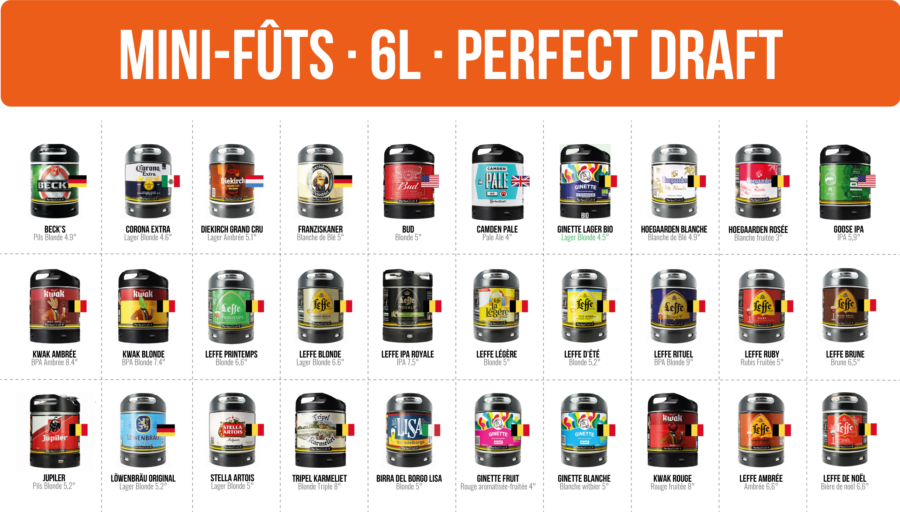 Ci-dessus, vous trouverez une sélection de nos mini fûts PerfectDraft, disponibles dans l’ensemble de nos magasins. Explorez une vaste gamme de saveurs provenant de brasseries renommées d’Allemagne, de Belgique et d’ailleurs. Laissez-vous tenter et faites de chaque dégustation une véritable découverte avec Bières et Chopes !
